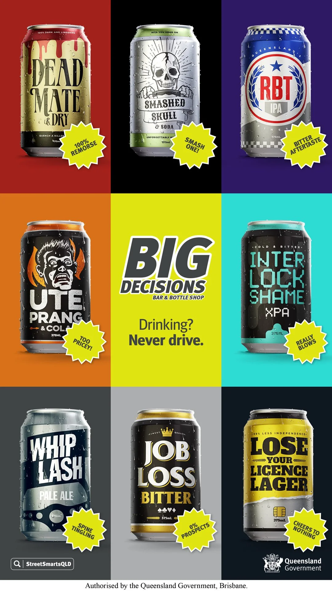 In 2023 alone, 816 casualties were hospitalised in Queensland due to drink driving. To confront road users with the sobering reality of choosing to drink and drive, we created a range of fake alcoholic products. Each product featured a direct consequence of the decision to get behind the wheel after drinking - putting the decision (and consequences) into their very own hands.
